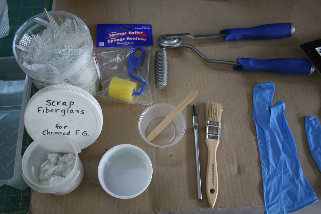 Here are shots of me getting everything I need laid out:<ul>[*]fuse halves[*]major sections of cut cloth (I used a 3 oz. tight weave, followed by a 6 oz. loose weave)[*]scrap cardboard to protect my work table and gloves to protect my hands(that epoxy gets messy and can be troublesome!)[*]flux brush[*]1-1/2" disposable trim roller[*]1" brush (the roller worked so well, that I never ended up needing this)[*]Also pulled to the workstation before starting, so it would be handy,was my scrap FG cloth, Olfa rotary cutter, a trash can, and a couple of paper towels.[/list]Once you start mixing epoxy, it is like a race; and, as I said earlier: "Life revolves around cure times."