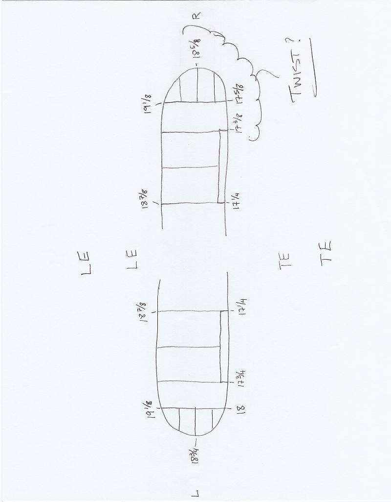 4) Weighed wings and both came in @ 1# 3.8 oz exactly. Connected wings (no fuse) they balanced perfect (didn't balance cord wise)