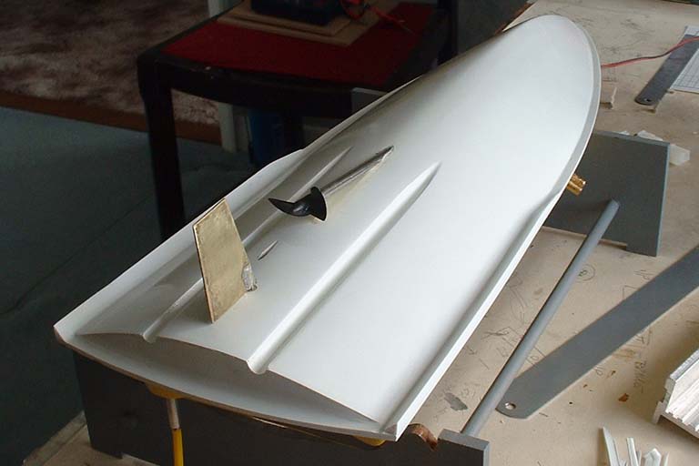 the boat goes in line(directo ..o recta...)and (no cabecea)the front dont go´s up and donw.All this WHITOUT TURN FIN or FLAPS.Only whit the desing of the donw face o boat.