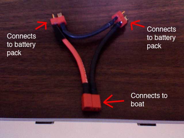 If your cat runs on 18 cells and the boat only has one deans plug and you have two 9 cell packs, you need what is called a series adapter. Its an adapter that connects to two batteries to double the voltage. They're easy to make. (look at the pics below)
