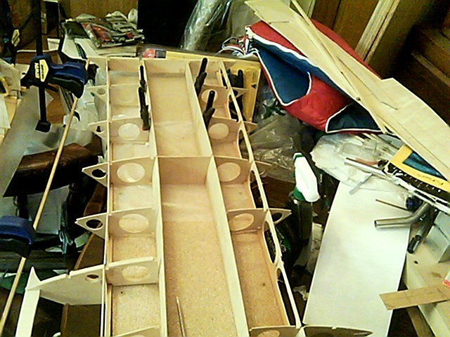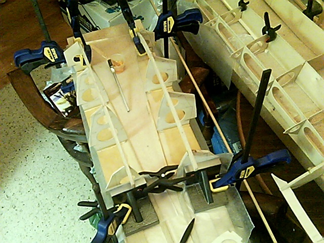 As for mine, I have all the stringers in except the left upper engine bay wall and the nontrips. Had to break away from it for the day so that I could repair my 2000 Elam so I can race it tomorrow. Had the the rudder pushrod and flex cable tube get ripped out and snapped in half by weeds back in July, haven't had the chance to touch it since. Just a matter now of resoldering the pushrod and I'm good to go |