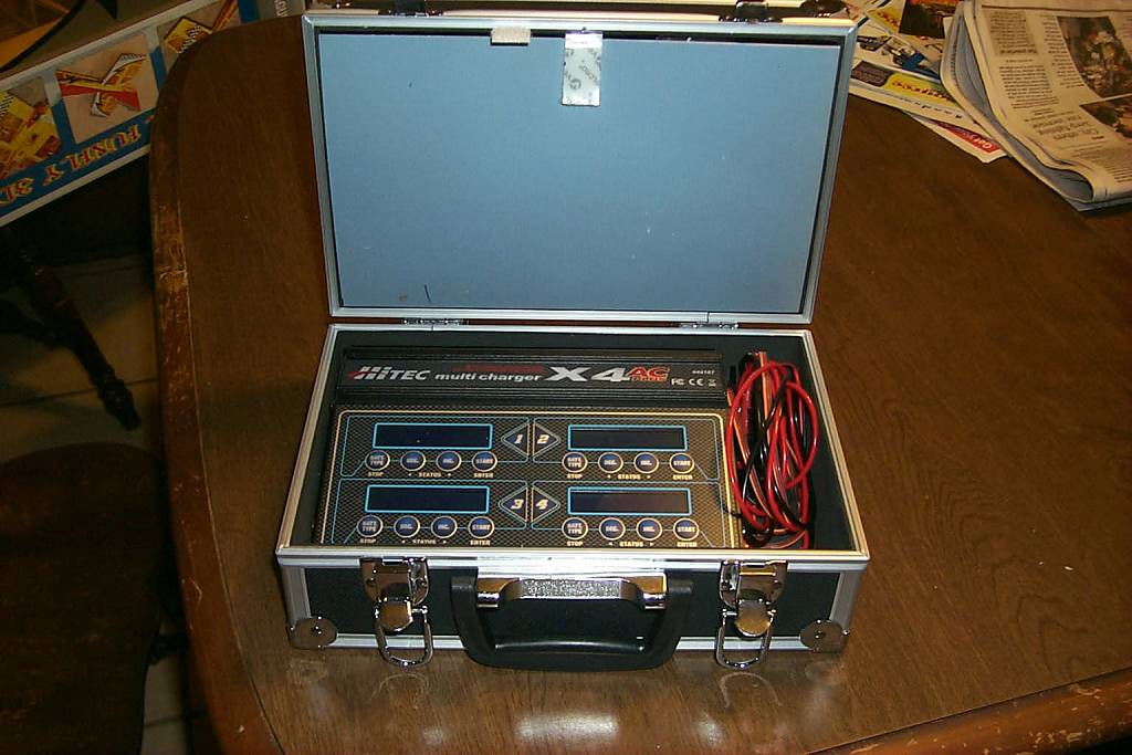 I was needing a case for hauling the Hitec X4 charger and found an ideal match at Harbor Freight. The X4 fits great with just enough room at one end for charging cables. The X4 sits about flush with the bottom section of the case, which leaves the top area to form a compartment. This was done with poster board, some reinforced vinyl tape for hinging it and some velcro sticky for clasp and pull strap.