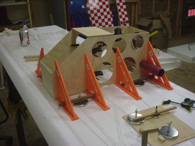 Here's a photo of my building table. Under that piece of ply is a sheet of steel when I build with magnets. On the larger planes (1/3) I use brad nails into ply. Works better and easier than pins, it would take to many magnets to hold down these larger parts. So when Im building a big one I build on ply and for the 120/150 size and smaller I use magnets. There are a few other photos of my shop under "tips and techniques- lets see your shop" http://www.rcuniverse.com/forum/m_13...mpage_3/tm.htm