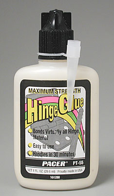 My LHS gave me a sample of a new CA glue from Bob Smith Industries that is made for CA hinges. Its called Insta-Flex and it is a thin CA that remains flexible when cured. It is being marketed for use with CA hinges. I have tried it on several sample pieces and I think it will be a big seller. The bond is extremely strong and because it stays flexible I think the hinge will perform better and should be less likely to fail. The test pieces I have made up are very smooth in motion with no popping or cracking when the hinge is moved, even to extreme throws similar to 3-D airplanes. (I used SIG easy hinges on my test pieces) The new glue is being produced in bottles with a Teal colored label and cap.