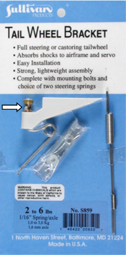 The bracket mounts on the fuselage and one end of a provided steering spring is attached to the bracket at the arrow in the picture, and the other end is bent at 90 degrees and inserted into the bottom of the rudder. When the rudder turns, the tailwheel turns. No additional hardware is needed.