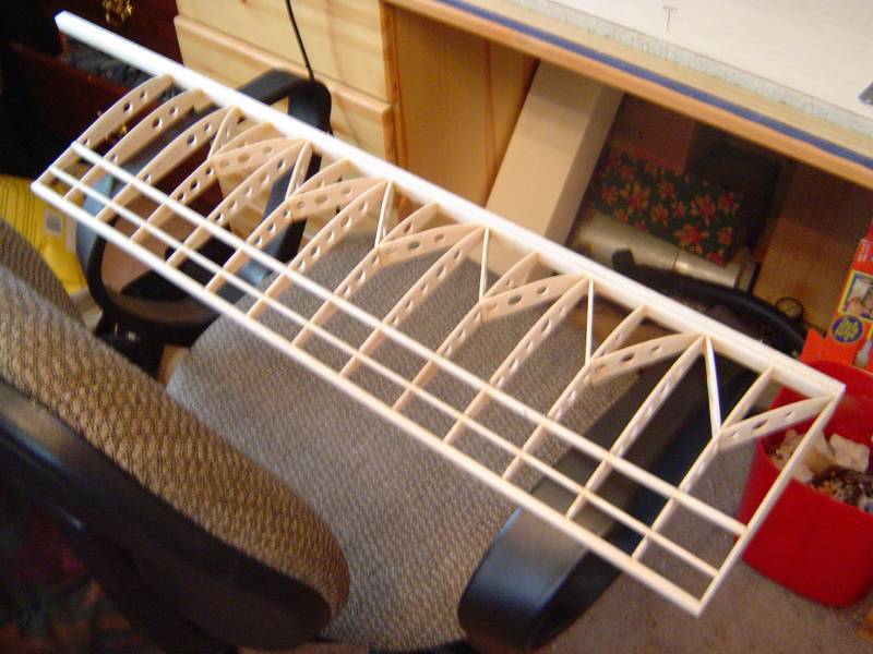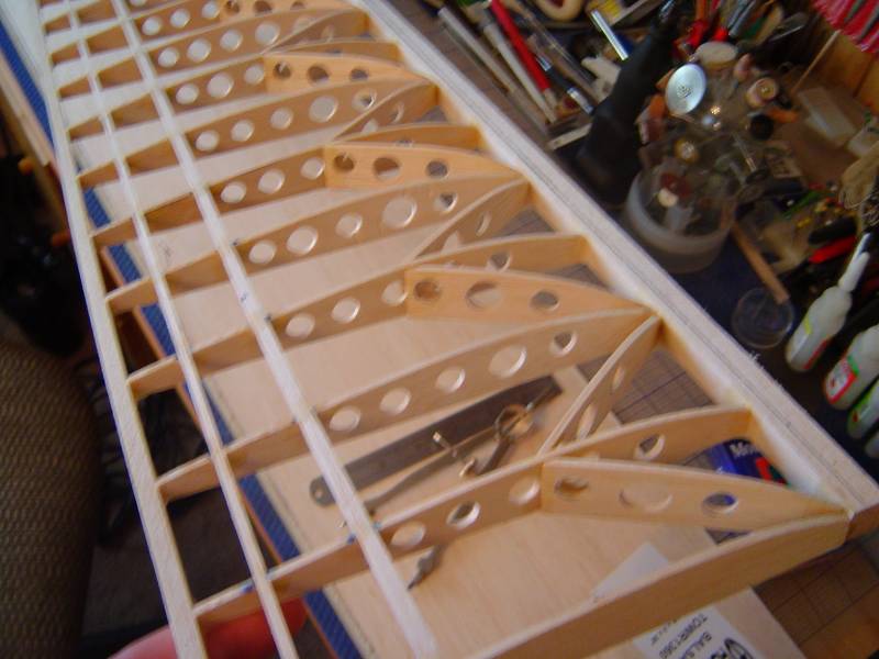 The picture with me holding a strap of wood on the rib is to show you how I intend to make an I-beam stle to the tops and bottoms with a 1/2 inch skin across the tips behind the leading edge.I want to seal the wood ribs and paint them chrome and use see through clear covering in that area.Im going to get things like a cowl and a canopy from Towers replacement parts to make it easier. not to change the subject,I just cant seem to navigate through "my account" area to find my old posts? I wish they would make that area easier to navigate. un less its just me..lol Ive been looking into trains too.Ebay has some nice deals on them.