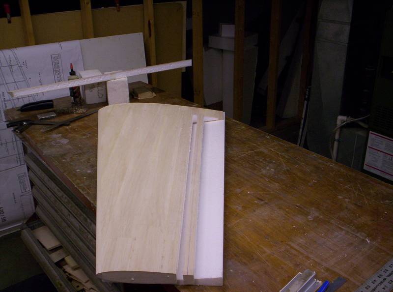 The foam block is first cut to the exact outline of the flying surface allowing for 1/2 balsa leading edge, the trailing edge is foam so the cores taper to almost nothing, I left about 1/32" of foam at the trailing edge to allow for melting as the wire pasts. 1/64" plywood strip about 3/4" wide is laminated under the balsa skin to provide a stiff trailing edge.