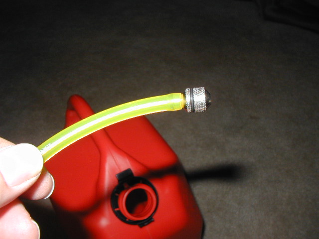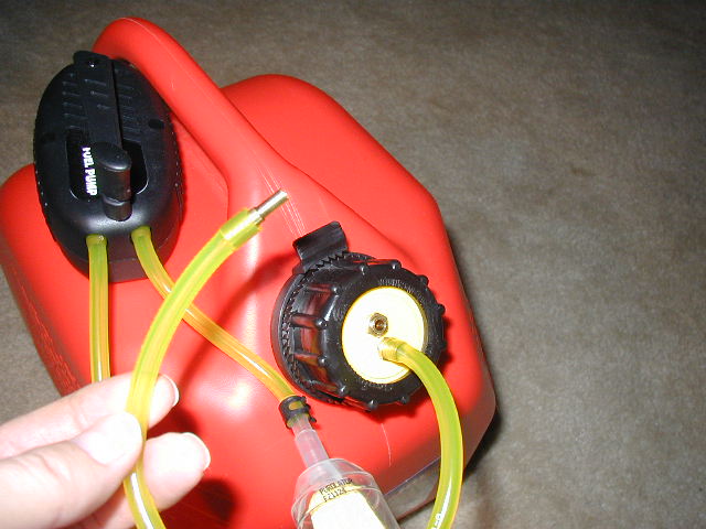 The Pep Boys can has a nice shape and a cap that can be easily modified. Advance Auto, etc. sells a good can, but the cap is not usable. You have to shave off a tab on the exterior of the cap you normally use to pick the cap up. Takes about 5 seconds with a dremel. Then you drill out the cap from the inside so you make sure the fitting nuts clear the edges, clean the holes up and mount the fittings. Run the pickup tubing down the spout into the can, put the fuel clunk/filter that comes with the Hangar 9 pump onto that and screw the cap ring on. Put the fuel line onto the external fittings, the pump, the fuel filter (if you want to run one), and the brass fueling plug and you are good. Dubro makes a neat one hole fitting that costs about 8 bucks, but is easier to install. However, it doesn't take but about two more minutes to install the one I used and I already had it. I plan to make a quick release clip to hang the pump off the handle. Have to snoop around the shop to see what I have available.