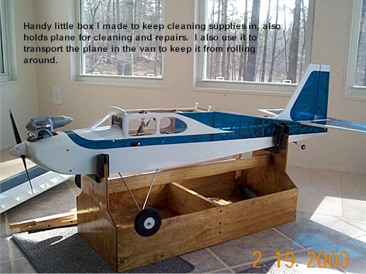 Here's a box I made to store, transport, clean and repair my Kadet Senior. There's plenty of room for paper towels and cleaning supplies and it doesn't take up that much room.