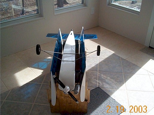 The tail wheel wire was bent from 1/8 music wire. At the top (in fuselage) there is a large metal servo arm secured to a wheel collar that is tightened to the wire. A 256 pull-pull system connects the tail wheel arm to the rudder servo.