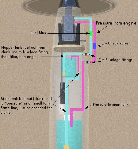 2. If you wont be using the Y.S. 4-stroke, then I think you need to be aware of a situation that I came across when setting up my first Ducted Fan Jet. Most ducted fan setups use a header tank and at least two saddle tanks. It is critical that the fuel tubing length be exactly the same from both tanks to the header or one tank will drain faster than the other. It seems that what you have is the exact opposite where the main tank will be filling two hopper tanks, hopefully at the same rate simultaneously. It seems to me this fuel line length issue would still apply in your situation so that the headers will fill at the same rate.