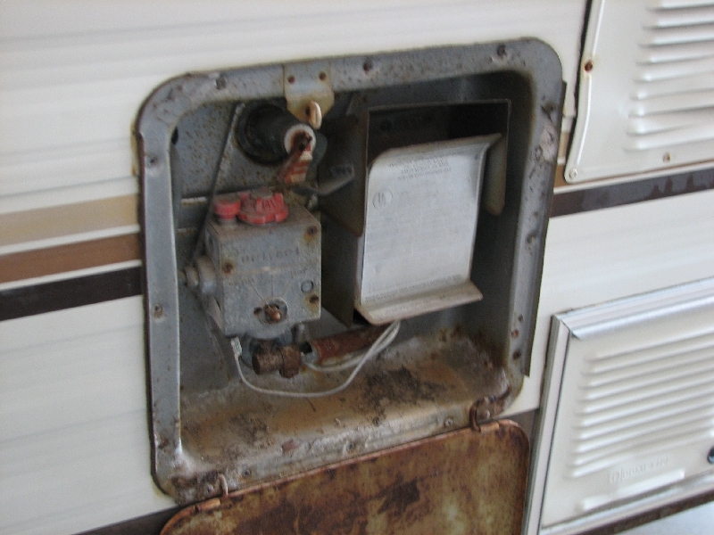 Here is the same area several minutes later without the cabinet (1st pic).... Then working on down the side the sink was next... pretty easy, just unscrew some wingnuts to pull the sink and disconnect some flexible tubing. A few hundred screws and a bit of hammering later and that's done. Next is the worst so far... the heater/water heater. Yikes!!! Cut this connection, disconnect that etc... etc... etc.. and then take the outside vent off and pull it out that way... Then take all the screws around the outside off.... and find that two of the screws are rusted [:@] so time for the grinder!!! That got it to move, but wait, you can't with that gray cardboard (heavy duty) shield around it so tear part of that off too [>:]!!! That did it... watch out for the water draining out the bottom all over your shoes