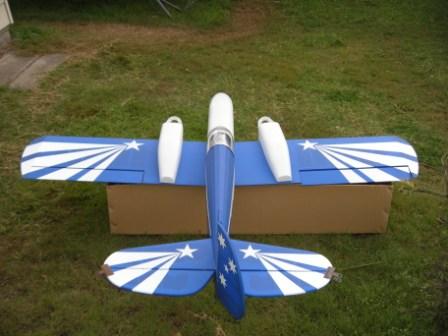 This is my Super Sportster twin made from a 60 kit. The wing span is 72". I added 11" to the center of the wing. I also added 1.5" to the front of the rudder. Running a two OS55 AX engines. Hope to test fly it soon. The picture is a little dark.
