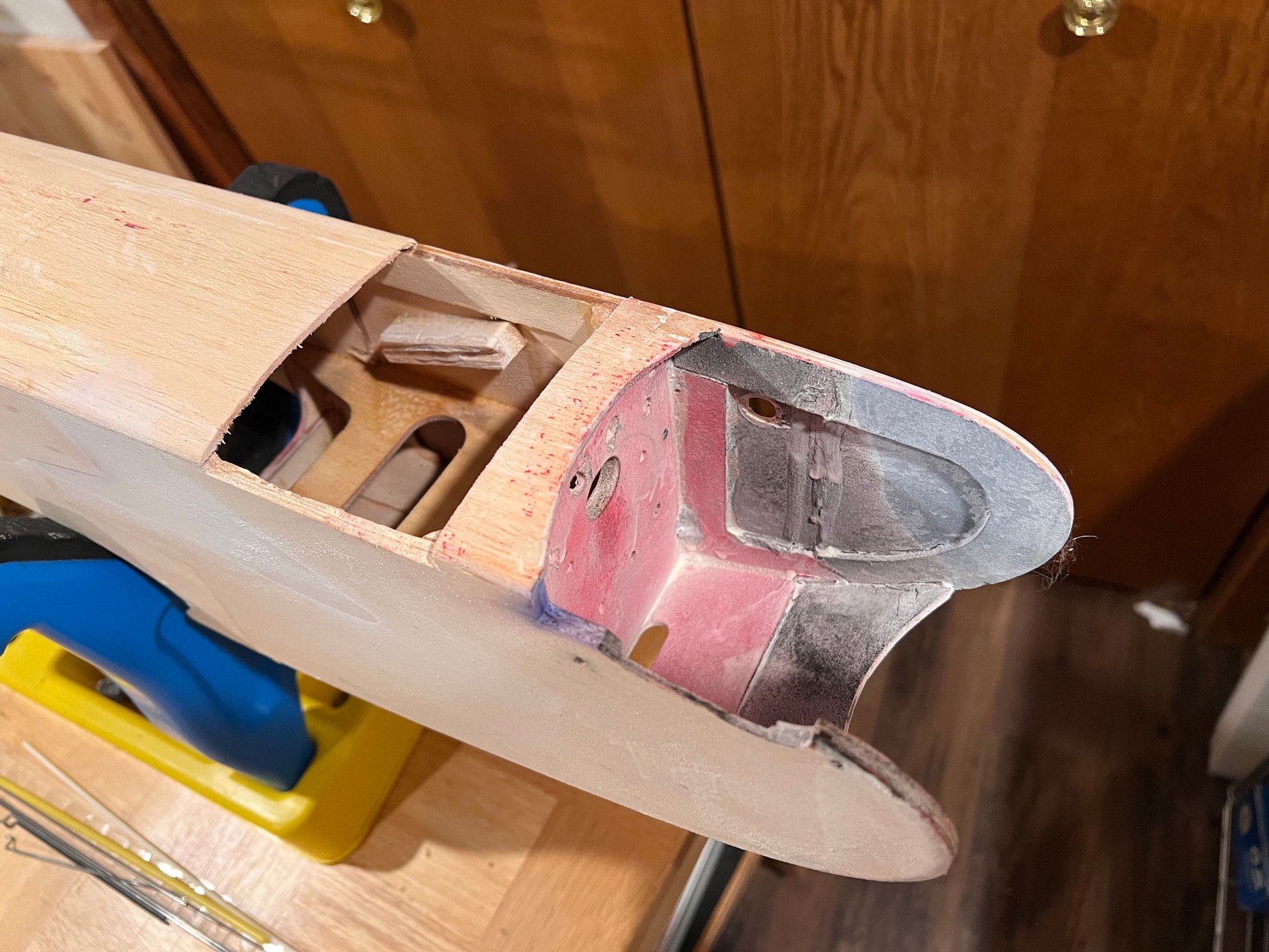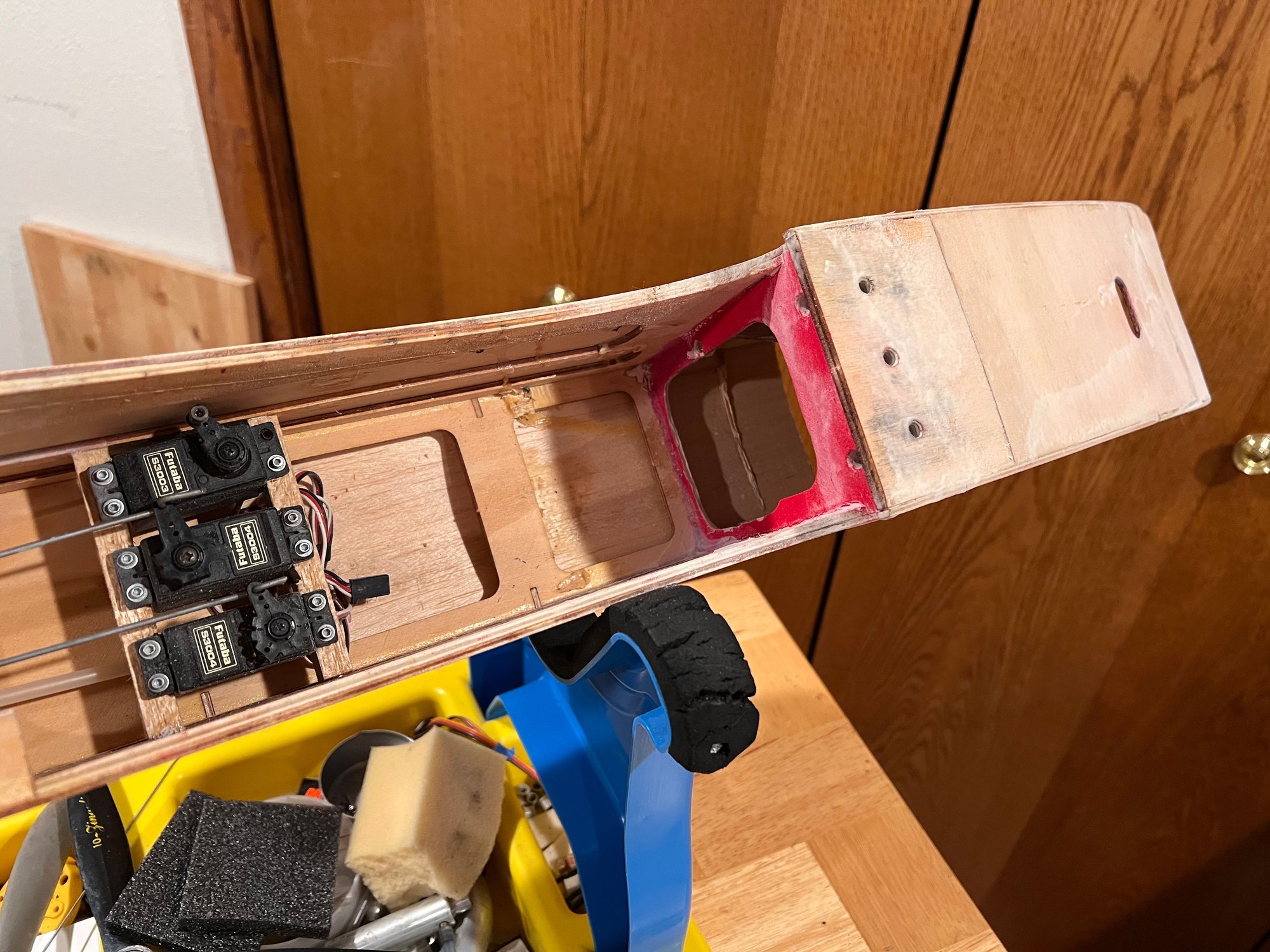 It came out very tailheavy. I had to move the rear mounted elevator servos up to the wing saddle area and add 11 oz of batteries to the extreme nose.