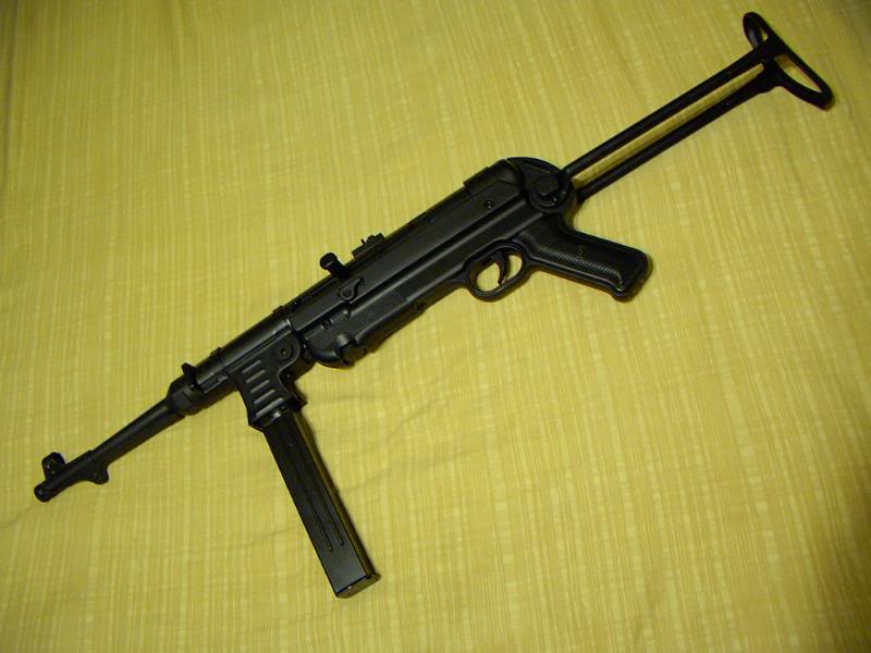 Thought you guys might like to see my German MP40 machine pistol replica. Its all metal, fullauto and very heavy! Just like the real one. Fires .20 plastic airsoft BB's at around 600 rpm and 250 fps. I got it from evike.com. Way to much fun!! The magazine holds about 50 rounds. Takes a 7.2 battery. The folding stock works and it field strips like the original.