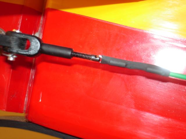 Cut the long cable into two equal lengths. On one end of both wires add the rod end as you hve done in your picture. Try to crimp each tube twice, once on each end in opposite directions. Make those crimps very tight. The heat shrink only adds looks and weight, nothing more. Attach the cables at the servo end after running them through the fuse. Install the clevisis and rod ends on the rudder horns without the wires. While maintaining the neutral position of the servo by having the radio turned on with the travels and sub trims centered, run the cables through the rod ends at the rudder horns. Be sure that the rudder is centered also. I like to use a couple of long sticks or arrow shafts, rubber banded together on both ends, with the rudder between them for this purpose. Try to get them pretty tight, but not tight enough to sound like a high pitched guitar string. Medium to high bass string will do. Crimp the tubes like you did on the servo ends and then adjust as needed. Don't forget to leave yourself a little adjusting room on the threaded ends when you assemble the wires.
