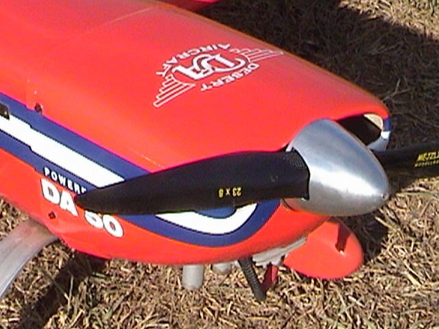 I will be flying the DA-50 in Naples Florida using the Slimline exhaust. The engine is brand spanking new, run approx. two minutes getting approx. 6600 RPM's now. Using 32:1 mix of Ashless oil and regular fuel. Temperture 80's - 90's most of the time, finally now getting cooler.