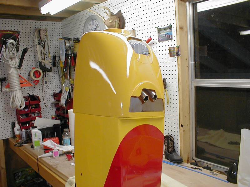 Cutting the cowl to fit over the muffler was a bit of a puzzle, but easily solved by shaving a bit off the bottom lip of the motor box and shaving a bit off the cowl ring at the top so the ring could pass over the prop shaft. There is no need to cut off muffler tips. I had already cut the tips off my Bison wraparound muffler for better engine performance. The cowl was cut just enough to fit over everything; I will be going back and widening everything for good engine cooling.