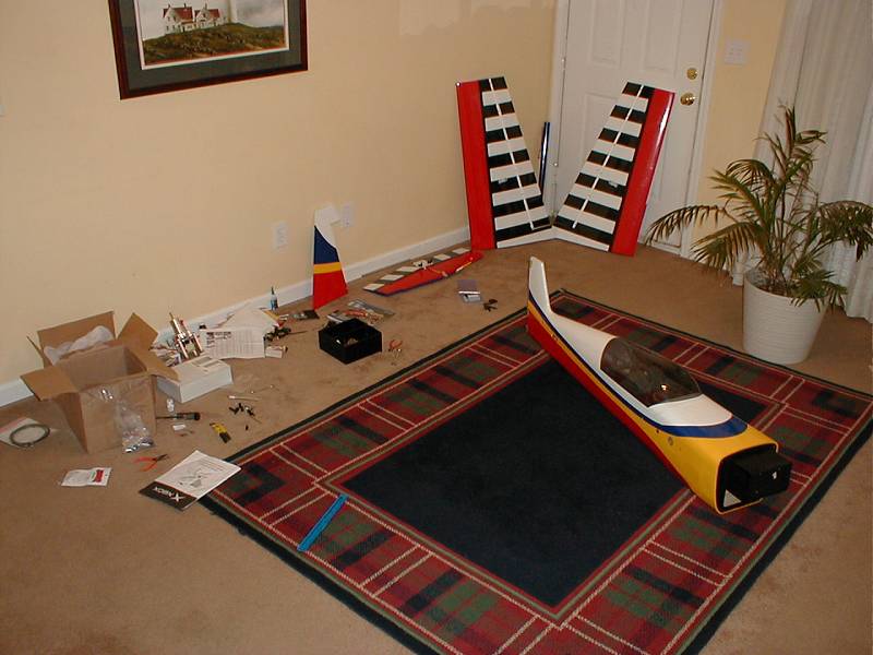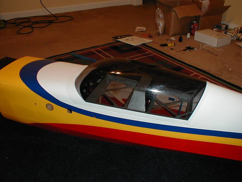 Wife is mad cuz I brought everything in the house. It’s too cold out in the barn 37 degrees. Sorry about you guys in the artic tundra. I glued on the canopy and painted the trim. It turned out very nice. Everything is going together perfect except for the following: The servo trays in the wings had predrilled screw holes. The holes on one end lined up perfect, but the other end was off enough that I had to fill them in using a tooth pick for a dowel and re-drill (no biggy.) I am using the Hitec 5955s in the wings. If I could have taken two days off work this week I would have been flying it Sunday [:@] #@%*!!!! Maybe next weekend.